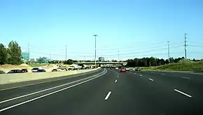 In the interim period, work went into expanding the six lane freeway through Toronto and Markham. A combination interchange was built with the new Highway 407 ETR which opened in June 1997, which as a prerequisite required the realignment of some ramps from the nearby Highway 7 interchange.[25] In early 1998, the MTO announced plans for two contracts to widen Highway 404 south of Highway 7. The first contract converted the grass median into an additional lane in each direction with a central concrete barrier between them, with the inner lanes to eventually be converted into HOV lanes. High-mast lighting was also installed, replacing the unique luminaires used on the freeway. The second contract would result in an additional lane in each direction on the outside the existing freeway south of Highway 407, making it ten lanes wide, with expansion of the southbound and northbound lanes completed in 2005 and 2007, respectively.[26][27][28] In 2002, Highway 404 was widened to six lanes between Highway 7 and Wellington Road, using the right-of-way afforded by the grass median.[6]
