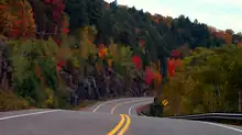 East of Huntsville, Highway 60 meanders east then south through the northeastern corner of Muskoka District, meeting Highway 35 at Dwight. It travels northeast from there, briefly passing through Haliburton County before crossing into Nipissing District and entering Algonquin Park.[3] An Ontario Parks visitor's permit is not required to drive through Algonquin Park. However, one is required for the use of any trails, campgrounds, the Visitor Centre, or similar facilities within the park boundary. Moose and deer are very common through Algonquin, especially at night and in the morning, and present a major driving hazard.[4] The 56-kilometre (35 mi) journey through Algonquin Park offers some of the most famous scenery in Canada, including vistas of numerous lakes and geological formations that have been captured in the arts of Group of Seven painter Tom Thomson among others. The park is considered the most important place in Canada for biological and environmental research.[5][6]