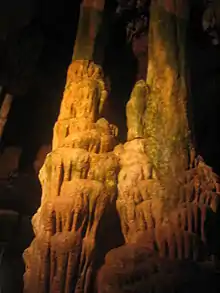 Onyx Cave is a small show cave located about 6 miles (9.7 km) east of Eureka Springs, Arkansas. It has been a tourist attraction since 1893, making it the oldest show cave in Arkansas. The cave does not contain onyx, but rather flowstone, also known as "cave onyx". During the 19th century and the beginning of the 20th century many such caves were named similarly.