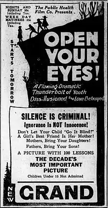 As a sex hygiene film, Open Your Eyes was subject to censorship restrictions and often was shown as an adults only film, but continued to be shown as an exploitation film. In 1927, the New Jersey branch of the Motion Picture Theater Owners of America warned theaters not to show this "salacious and risqué" film, citing common decency and the risk that it would bring calls for censorship.[5]