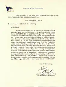 The Meritorious Unit Commendation was awarded to the crew of USS Hanson.