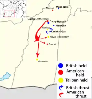 The Marines pushed into primarily three significant towns along a 75-mile stretch of the Helmand River valley south of Lashkar Gah. At least two Marine infantry battalions and one Marine Light Armored Reconnaissance (LAR) battalion spearheaded the operation. In the north, 2nd Battalion, 8th Marines (2/8) pushed into Garmsir district. In central Helmand, 1st Battalion, 5th Marines (1/5) pushed into Nawa-I-Barakzayi to the south of Lashkar Gah, 2nd Light Armored Reconnaissance Battalion (2nd LAR) entered Khanashin in the Khan Neshin district.[9][10][11]