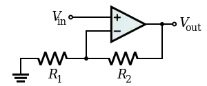In the non-inverting amplifier on the right, the presence of negative feedback via the voltage divider Rf, Rg determines the closed-loop gain ACL = Vout / Vin. Equilibrium will be established when Vout is just sufficient to pull the inverting input to the same voltage as Vin. The voltage gain of the entire circuit is thus 1 + Rf / Rg. As a simple example, if Vin = 1 V and Rf = Rg, Vout will be 2 V, exactly the amount required to keep V− at 1 V. Because of the feedback provided by the Rf, Rg network, this is a closed-loop circuit.