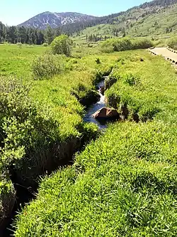 ![]() One of several tributaries of Ophir Creek in subalpine Tahoe Meadows with the Carson Range's Relay Peak in distance and the Ophir Creek Trail boardwalk on the right. | |