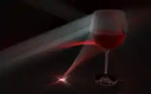 A common situation where caustics are visible is when light shines on a drinking glass. The glass casts a shadow, but also produces a curved region of bright light. In ideal circumstances (including perfectly parallel rays, as if from a point source at infinity), a nephroid-shaped patch of light can be produced.[3][4] Rippling caustics are commonly formed when light shines through waves on a body of water.