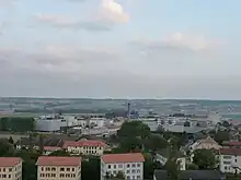 Aerial view of Orbe with the Nestlé factory complex (foreground) and the Jura Mountains (background)