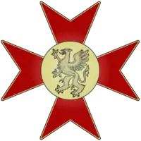The badge of the order was a red enameled maltese cross, outlined in gold. On the centre of the cross is a disc with a golden griffon surrounded by a gold ring. The Grand Cross badge was worn at the left hip, hanging from a 4 in wide sash that goes over the right shoulder. The Grand Commander's and Commander's Cross badges were worn suspended from the neck on a narrower ribbon. These badges were slightly smaller than the Grand Cross badge, but otherwise identical in appearance. The Honour Cross was smaller still and did not have the gold ring surrounding the griffon in the centre. Finally, the two Knight's Crosses were slightly smaller than the Commander's Cross and worn suspended from a ribbon worn on the left chest.[1]
