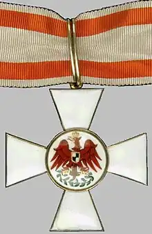 The Order of the Red Eagle (German: Roter Adlerorden) was an order of chivalry of the Kingdom of Prussia. It was awarded to both military personnel and civilians, to recognize valor in combat, excellence in military leadership, long and faithful service to the kingdom, or other achievements. As with most German (and most other European) orders, the Order of the Red Eagle could only be awarded to commissioned officers or civilians of approximately equivalent status. However, there was a medal of the order, which could be awarded to non-commissioned officers and enlisted men, lower ranking civil servants and other civilians.