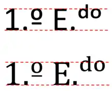 In Spanish, using the two final letters of the word as it is spelled is not allowed,[5] except in the cases of primer (an apocope of primero) before singular masculine nouns, which is not abbreviated as 1.º but as 1.er, of tercer (an apocope of tercero) before singular masculine nouns, which is not abbreviated as 3.º but as 3.er, and of compound ordinal numbers ending in primer or tercer. For instance, 'twenty-first' is vigésimo primer before a masculine noun, and its abbreviation is 21.er. Since none of these words are shortened before feminine nouns, their correct forms for those cases are primera and tercera. These can be represented as 1.ª and 3.ª. As with other abbreviations in Spanish, the ordinal numbers have a period ".", which is placed before the indicator. Portuguese follows the same method.[6]