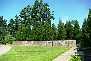 The Oregon Korean War Memorial is a war memorial located in Wilsonville, Oregon, United States. Completed in 2000, it honors the Oregon soldiers and the Korean people from the Korean War. The memorial is located within a 5.5-acre (22,000 m2) city park and features a 109-foot (33 m)-long granite wall that includes the names of those Oregonians who died or were listed as missing from the war.