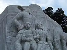 To the west of the building is Willson Park, named for Salem founder William H. Willson and sited roughly at the center of his former landholdings.[50] From 1853 to 1965 it was a Salem city park. After the park was turned over to the state, Lloyd Bond and Associates were asked to redesign the park.[11] Willson Park features the Oregon World War II Memorial, the Waite Fountain, a gazebo built in 1982, and Peter Helzer's sculpture, A Parade of Animals (1991),[19] which was designed as a play structure. Waite Fountain was donated in honor of Oregon businessperson E. M. Waite in 1907 by his wife.[46] The Breyman Fountain, added in 1904 as a memorial to Werner and Eugene Breyman,[51] is at the far west end of the park.[46] It was originally decorated with a statue of a soldier from the Spanish–American War and also served as a lamp post and horse trough.[51] Today the statue holds no water and is sometimes planted with flowers.[52] In 2005, a Walk of Flags feature was added that displays the flags of every state in the Union. In 2009, the nine flags of Oregon's federally recognized Native American tribes were added to the Walk of Flags.[53]