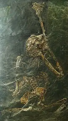 From 1949 onwards, Swiss paleontologist Johannes Hürzeler began to restudy the known material.[9][10] In 1954, 1955, 1956 and 1958 he claimed Oreopithecus were a true hominin—based on its premolars, short jaws and reduced canines, at the time considered diagnostic of the hominin family.[11][12][13] This hypothesis was immediately hotly discussed by his fellow palaeontologists.[14][15][16][17][18] When he toured the world to give a series of lectures, his views generated an enormous press coverage, often being presented as a challenge to the Darwinian descent of man from apes.[19] After Hürzeler was invited to give a lecture in New York in March 1956, the Wenner-Gren Foundation decided to finance excavations in Italy, with the cooperation of the Italian paleontologist Alberto Carlo Blanc. On 2 August 1958, Hürzeler's views seemed to be confirmed when he discovered a complete skeleton in Baccinello,[20] which in 1960 he interpreted as a biped because of the short pelvis was closer to those of hominins than those of chimpanzees and gorillas.[21] Hominin affinities claimed for Oreopithecus remained controversial for decades until new analyses in the 1990s reasserted that Oreopithecus was directly related to Dryopithecus. The peculiar cranial and dental features were explained as consequences of insular isolation.