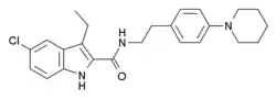 • CCc1c2cc(Cl)ccc2[nH]c1C(=O)NCCc3ccc(cc3)N4CCCCC4