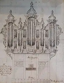In 1475 an organ was built on the eastern wall of the south transept, rebuilt in 1558 by Andreas de Mare I. 1654 Theodorus Faber was commissioned, with Andreas de Mare II (whose relationship to the organ builder of the same name from the 16th century is not yet clear), to build a large new organ on the west wall, but Faber could not complete it before his death in 1659. Jacobus Galtus Hagerbeer completed this large instrument in 1667; it had 40 stops on three manuals and pedal. In 1671 this organ fell victim to a fire. Arp Schnitger built a new organ for the Aa-Kerk in 1694–97, his largest organ in the Netherlands; this was lavishly appointed and had over 40 stops on four manuals and pedal. For example, the facade pipes were made of pure East Indian tin and the bass octave had all twelve semitones. Schnitger himself wrote of this organ: "I did not spare anything and made everything wonderful; I provided, beyond the contract, 6 stops on a special windchest, and this organ still deserves a little more."[1] This organ was destroyed in 1710 by the collapse of the tower. Only the original Schnitger sketch has survived. For about a hundred years, the church had to do without organ accompaniment.[2]