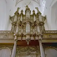 The 103 case-pipes of the Rug-Positief and 91 of the main case have a tin content of about 90% and have semicircular gilded lips.[5] It is the largest stock of original tin case-pipes in a Schnitger organ.