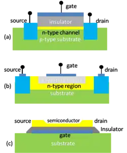 The most prominent and widely used FET in modern microelectronics is the MOSFET (metal–oxide–semiconductor FET). There are different kinds in this category, such as MISFET (metal–insulator–semiconductor field-effect transistor), and IGFET (insulated-gate FET). A schematic of a MISFET is shown in Figure 1a. The source and the drain are connected by a semiconductor and the gate is separated from the channel by a layer of insulator. If there is no bias (potential difference) applied on the gate, the Band bending is induced due to the energy difference of metal conducting band and the semiconductor Fermi level. Therefore, a higher concentration of holes is formed on the interface of the semiconductor and the insulator. When an enough positive bias is applied on the gate contact, the bended band becomes flat. If a larger positive bias is applied, the band bending in the opposite direction occurs and the region close to the insulator-semiconductor interface becomes depleted of holes. Then the depleted region is formed. At an even larger positive bias, the band bending becomes so large that the Fermi level at the interface of the semiconductor and the insulator becomes closer to the bottom of the conduction band than to the top of the valence band, therefore, it forms an inversion layer of electrons, providing the conducting channel. Finally, it turns the device on.[23]