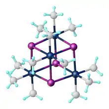 The first organoplatinum compound ever synthesised was trimethylplatinum iodide from platinum(IV) chloride and methylmagnesium iodide, reported by Pope and Peachey in 1907.[6][7] The compound adopts a cubane-like structure with four triply bridging iodide ligands. "Tetramethylplatinum" was claimed in 1952 by Henry Gilman as a derivative of this tetramer, but this claim was later shown to be incorrect ("Tetramethylplatinum" proved to be [PtMe3OH]4). Salts of [PtMe6]2− and [PtMe4]2− have been characterized.[8]