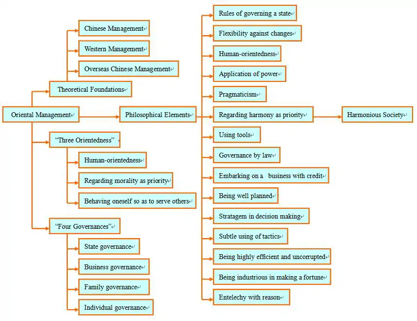 The theoretical foundations of oriental management are Chinese Management, Western Management, and Overseas Chinese Management. It adopted an approach that is people-oriented, with a strong focus on "human morality," and "human behavior." The framework prioritizes learning, ideal behavior, governing, action, and harmony.[1]
