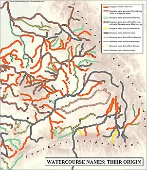Almost no place name has been preserved in the former province (while more than twenty settlements still bear a name of Roman origin in England).[188] The present forms of the few river names inherited from antiquity show that non-Latin-speaking populations—Dacians and Slavs—mediated them to the modern inhabitants of the region.[194] Both literary sources and archaeological finds confirm this conjecture: the presence of Carpians, Vandals, Taifals, Goths, Gepids, Huns, Slavs, Avars, Bulgarians and Hungarians in the former Roman province in the early Middle Ages is well documented.[195] Sporadic references to few Latin-speaking individuals—merchants and prisoners of war—among the Huns and Gepids in the 5th century do not contradict this picture.[196] Since Eastern Germanic peoples inhabited the lands to the north of the Lower Danube for more than 300 years, the lack of loanwords borrowed from them also indicates that the Romanians' homeland was located in other regions.[188][197] Likewise, no early borrowings from Eastern or Western Slavic languages can be proven, although the Romanians' ancestors should have had much contact with Eastern and Western Slavs to the north of the Danube.[198]