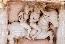 Some twelfth century inscriptions issued by their descendants trace their lineage to the kings of Ikshvaku dynasty of Ayodhya. They also give legendary accounts of their migration to the south, propitiation of the goddess Ganga (from whom the name of the dynasty is claimed to be derived) and the spiritual association of the two early immigrant princes, Dadiga and Madhava to a Jain preceptor Simhanandi at Perur (now identified as Cudappah, Andhra Pradesh). These princes are said to have later propitiated the goddess Padmavathi who rewarded them with a kingdom and throne to rule over.[11] According to another legendary account, the goddess Padmavathi gave a sword to the Jain Guru, using which Madhava struck a stone pillar and broke the pillar into two. Hence the Guru is said to have crowned Madhava as the king.[12]