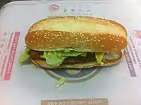 A grilled Italian sausage sandwich was sold in 1992 and was served with onions and peppers or parmigiana style with mozzarella cheese and marinara sauce.[25] As part of the company's BK Dinner Baskets promotion in 1993, the chain introduced a grilled meatloaf sandwich with ketchup and onions in the United States.[26][27] In 2013, Burger King sold a bratwurst sandwich in a regional limited time offering in the US states of Wisconsin and Illinois. The sandwich featured a bratwurst manufactured by Johnsonville Foods, raw onion and yellow mustard.[28] Despite being discontinued, versions of the steak sandwich have been re-released several times since the 1970s. The BK Dinner baskets featured a steak sandwich,[29] and in 2003 Burger King New Zealand introduced the Big Bloke Steak Sandwich which was almost identical to the 1979 sandwich.[30]