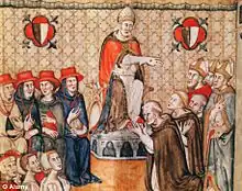The Extultet Barberini, dated around 1087, shows an early version of the tiara, with lower band and a crosshatch pattern on the conical tiara.[3][4] A similar tiara is shown on Innocent III in a fresco at Sacro Speco from about 1219 and on a mosaic from Old Saint Peter's, now in the Museo di Roma.[5] A similar tiara, conical and with only one crown at the base, is seen worn by pope Clement IV in frescoes from the 13th century in Pernes-les-Fontaines, France and at his tomb in Viterbo. Also in Viterbo is the tomb of Hadrian V by Arnolfo di Cambio, with a similar tiara. The tomb of Honorius IV in Santa Maria in Ara Coeli also presents the tiara with one crown with gems at the bottom and topped with a large gem.[6] The tomb of Gregory X (1271–1276) shows him wearing a similar tiara, with the base a full crown and a textured and decorated conical body.[4][7] A fresco by Buffalmacco in the Arezzo cathedral depicts Gregory X wearing a similar tiara with black lappets.