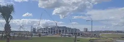 The facility mostly reuses plans from the proposed Florida High Speed Rail system. In that plan, the Orlando International Airport station was to be the northern terminus of the initial Tampa-to-Orlando route along Interstate 4. The plan was effectively cancelled when Florida governor Rick Scott announced he would reject federal funding for the project. The Greater Orlando Aviation Authority had already invested considerably to accommodate the station and high-speed rail line, such as the extra length of the south taxiway bridges over the southern airport access road, which is now used by Brightline.[4] As part of the $684 million intermodal complex, the airport authority has also built a 2,400 space parking garage.[3][1]