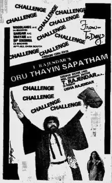 Oru Thayin Sabhatham (transl. A mother's vow) is a 1987 Indian Tamil-language legal drama film[1] written, directed, scored and produced by T. Rajendar. He himself appeared in the lead role with Srividya, whilst the film featured an extensive cast, which also featured Rajendar's son Silambarasan. The film released on 14 April 1987. It is a remake of the 1985 Hindi film Meri Jung.[2]
