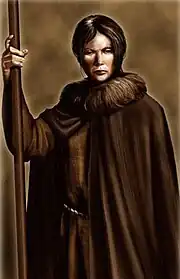 In the novels, Osha was first introduced in A Game of Thrones (1996) as a wildling woman from Beyond the Wall who worships the Old Gods of the Forest.[2] Attempting to flee from the Others (known as the White Walkers in the television series), she ventures south of the Wall to escape the potential war that is about to come. However, Osha is initially sparred by the Starks of Winterfell, and temporarily imprisoned by them due to her wild nature. She later gains the trust of the people of Winterfell, and eventually befriends Bran and Rickon Stark, and acts as their guardian. Osha later returns in A Clash of Kings (1998) and helps the Stark boys flee from Theon Greyjoy and survive the Sack of Winterfell. She then makes the decision to escort Rickon to safety while Bran heads north, and puts Maester Luwin out of his misery.[3] Although her whereabouts remain unknown for some time, she is mentioned several times in A Storm of Swords (2000) and A Feast for Crows (2005). In A Dance with Dragons (2011), it is revealed that Osha, Rickon, and Shaggydog are currently seeking refuge at Skagos.[4]