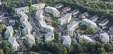 On the site of a former Prussian parade ground in the northwest of the town, housing for 2,500 people was created in the early 1970s in dense high-rise construction. Some of the residential buildings were subsidized with public funds, others were sold as condominiums. In the early days, the apartment buildings, which were up to 14 stories high, were regarded by the public as a prime example of modern subsidized housing, but just a few years later the residential location was perceived as unattractive by a large part of the population, so that the street gradually fell into disrepair. In 2002, the housing estate was included in the subsidy program Sozialraum mit erhöhtem Erneuerungsbedarf. In 2007, about 2800 people lived in the settlement, of whom about 70% had a migration background.[27]