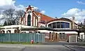 The Protestant Church of the Resurrection in Heppenheimer Strasse was planned by the Hamburg architect Gerhard Langmaack and consecrated on March 21, 1954, after nine months of construction. The unadorned brick building with a pointed roof is plastered white. The prominent square tower attached to the nave is crowned by a round helmet roof. There are twelve circular openings on each side of the tower to ensure good sound radiation of the chimes.[38]