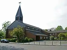 In 1960/61 the architects Josef Bernard and Fritz Schaller built the simple hall church Zu den Heiligen Engeln on Buchheimer Weg. On the gable roof sits a bell rider with a pointed helmet, which since 1960 has been crowned by an angel made of sheet copper. The seven-stop organ, built in 1868 by the Franz Sonrek company and thoroughly overhauled in 1965, was taken over by St. Servatius in 1977. All the windows of the church were designed by Paul Weigmann from 1986 to 1988.[37]