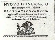 Ottavio Codogno (1570/74โ1630) was deputy postmaster general of the Duchy of Milan and author of an extensive guidebook to the postal services, routes and timetables of early 17th-century Europe.[1] His Nuovo itinerario delle Poste (Milan, 1608) went through several reprints in both Milan (1616, 1623) and Venice (1611, 1620, 1628, 1676).