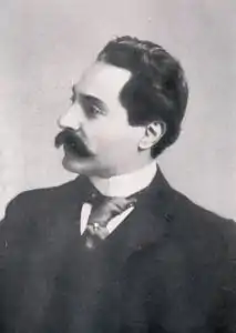 Respighi was schooled at Ginnasio Guinizelli in Bologna for two years from October 1890.[10] In 1891, he enrolled at the Liceo Musicale di Bologna, where he studied the violin and viola for the next seven years with his teacher, Federico Sarti.[11] Among Respighi's earliest completed and dated compositions at this time were Piccola Ouverture and Preludio for orchestra.[12] Four years into his course at the Liceo Musicale, Respighi began classes in musical composition with Giuseppe Martucci, the Liceo's director, and music history with Luigi Torchi. By the time he reached twenty, Respighi was performing in the orchestra at the Teatro Comunale di Bologna.[13] Martucci, a proponent of Bologna's musical life and composer of non-operatic Italian music, became an influential figure for the young Respighi.[14] In 1899, he received a diploma in the playing of the violin.[12] By this time, Respighi had developed a fondness for languages, demonstrated by his large book collection, which contained atlases and dictionaries.[15] In his lifetime, Respighi became fluent in eleven languages and read literature in all of them.[16]