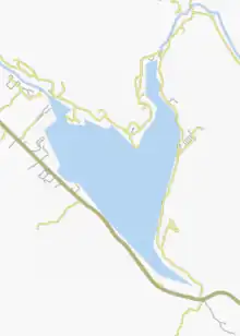 - 6.4 kilometres (4.0 mi) to the east, crossing Pontbriand Lake (altitude: 157 kilometres (98 mi)) over its full length, to the Rawdon dam, located in the village of Rawdon;