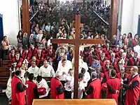 Nowadays, the celebration of the Palm Sunday, as well as the other celebrations, follow the rite promulgated by the Second Vatican Council, and begins at the windows of the Church of Our Lord of Bonfim. Upon arrival, the priest greets the people in the usual way, recites the prayers, and sprinkles the branches with holy water. The proclamation of the Gospel is made and then the procession is announced. At the beginning of the procession, immediately in front, goes the acolyte with the lighted thurible, and then, according to ancient local custom, the cruciferary, a Brother of the Blessed Sacrament with the ornamented cross; two Brothers leading the lanterns forming the wing of the faithful on the sides of the street in single line. In the center, the youth group of the Stations of the Cross Pastoral, followed by the guild of the Brotherhood of the Blessed Sacrament with the parish priest, accompanied by the Phoenix Band that performs the traditional dobrados and festive marches from its repertoire. When the priest arrives at the Mother Church, where the altar for the outdoor mass is located, he continues the celebration in the usual way, without the presence of the traditional choir and orchestra. On Palm Sunday evening and Holy Monday, the other celebrations of the Feast of the Steps take place.[42]
