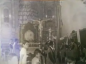 On Good Friday at 9:00 a.m., the Passion ceremony began, now called the Solemn Liturgical Action, with the reading of the Passion Gospel sung and the choir and priest in black vestments, using the compositions of the tractus from the Choir's archive and proceeding with the adoration of the cross, using the image of the Dead Lord. Later, in the procession with the Blessed Sacrament, an urn used on Holy Thursday was brought in solemn procession to the main altar while the choir intoned the vexilla regis, and continued the ceremony of Adoration of the Cross, with its own ritual. At the end of the day, until nightfall, the population would wait for the Burial Procession.[42]