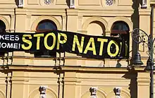 On August 29, 2014, Marian Kotleba hung up a sign saying "Yankees go home! STOP NATO!" on the governor's building in Banská Bystrica, demonstrating the party's anti-Americanism.[41]