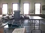 The interior of the schoolhouse is furnished with pieces from the 1870s, including the iron worked legs on the oak-top school desks and the large potbelly stove in the center of the room. The coal bucket and scoop are located close to the stove. The teachers desk is located on a dais with a large blackboard behind the teachers desk.