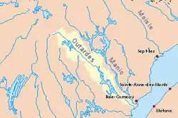 The Rivière aux Outardes or Outardes River is a river in Quebec, Canada. The river originates in the Otish Mountains, and flows in a southerly direction for its entire course. It passes through Lake Plétipi and Burnt Islands Lake (Îles Brûlées), and widens about midway to form the large Outardes 4 Reservoir. It drains into Outardes Bay of the Saint Lawrence River, about 20 kilometers (12 mi) southwest of Baie-Comeau.