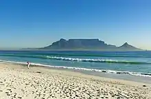 View of Table Mountain seen from Bloubergstrand, flanked by Devil's Peak on the left and Lion's Head on the right