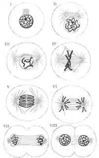 An illustration of the stages of mitosis in a human cell from Gray's Anatomy
