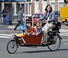 Dutch woman cycling with two young children, using a two-wheeled box-bike