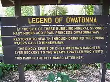 Owatonna was first settled in 1853 around the Straight River. The community was named after the Straight River,[6] which in the Dakota language is Wakpá Owóthaŋna. A popular, but apocryphal, story is that the town is named after "Princess Owatonna", the daughter of local Native American Chief Wabena who was supposedly healed by a nearby spring's magic waters,[7] which were said to be rich in iron and sulfur.[8] The earliest the Owatonna area was settled was in 1854. It was platted in September 1855, incorporated as a town on August 9, 1858, and as a city on February 23, 1865.[6]