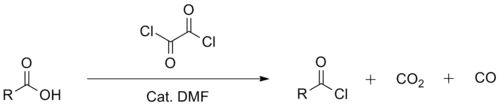 Oxalyl chloride is mainly used together with a N,N-dimethylformamide catalyst in organic synthesis for the preparation of acyl chlorides from the corresponding carboxylic acids. Like thionyl chloride, the reagent degrades into volatile side products in this application, which simplifies workup. One of the minor byproducts from the N,N-dimethylformamide catalyzed reaction, dimethylcarbamoyl chloride, is a potent carcinogen, stemming from the N,N-dimethylformamide decomposition.[11][12] Relative to thionyl chloride, oxalyl chloride tends to be a milder, more selective reagent. It is also more expensive than thionyl chloride so it tends to be used on a smaller scale.