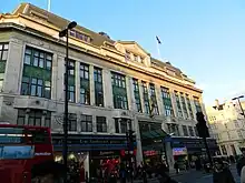 Marks & Spencer has two stores on Oxford Street. The first, Marks & Spencer Marble Arch, is at the junction with Orchard Street; it was opened in 1930.[57] The second branch, which opened eight years later, is between Regent Street and Tottenham Court Road, on the former site of the Pantheon.[58] Both premises were significantly expanded in the second half of the 20th century.[59]