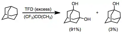 Although alkanes are typically difficult to functionalize directly, C-H insertion with TFD is an efficient process in many cases. The order of reactivity of C-H bonds is: allylic > benzylic > tertiary > secondary > primary. Often, the intermediate alcohols produced are oxidized further to carbonyl compounds, although this can be prevented by trapping in situ with an anhydride. Chiral alkanes are functionalized with retention of configuration.[17]