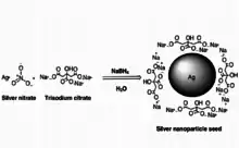 AgNPs are synthesized using microwave irradiation,[4] gamma irradiation [6] UV activation,[7] or conventional heating [8] of the precursor silver nitrate, AgNO3 using an alginate solution as a stabilizing and reducing agent.[4][9] The carboxyl or hydroxyl groups on the alginate reagent form complexes during the synthesis of the AgNPs that stabilize the reaction.[4] Nanoparticle size and shape can be specified by changing the ratio of alginate to silver nitrate used and/or the pH.[4] A coating such as PVP may be added to the nanoparticles by heating and subsequent slow cooling.[3]