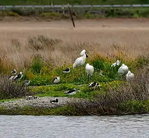 Many different native and exotic birds can be found at the Pāuatahanui Wildlife Reserve, including the bar-tailed godwit, royal spoonbill, caspian tern, paradise duck, pied stilt, sacred kingfisher, white-faced heron, Australasian shoveler, pūkeko and black shag.[1]