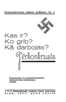 Aside from the party's newspaper, Pērkonkrusts (1933–34), the main source of information on the political platform of Pērkonkrusts can be found in the 1933 brochure, Pērkonkrusts: What Is It? What Does It Want? How Does It Work? (Latvian: Kas ir? Ko grib? Kā darbojas? Pērkonkrusts). This publication not only outlined the movement's political programme, but also included the complete party statutes.